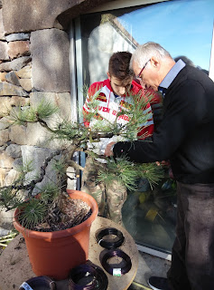 Travaux sur mon pin: Après avoir fendu le tronc pour le rendre plus maniable ensuite il est protégé par du raphia pour réaliser une torsion de celui-ci afin de réorienter les branches vers l'arrière